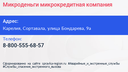 Микроденьги, микрокредитная компания по адресу Карелия, Сортавала, улица Бондарева, 9а в дальнейшем Организация, размещена в следующих категориях: