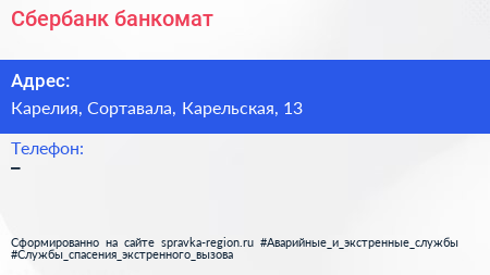 Сбербанк, банкомат по адресу Карелия, Сортавала, Карельская, 13 в дальнейшем Организация, размещена в следующих категориях: