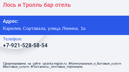 Лось и Тролль, бар-отель по адресу Карелия, Сортавала, улица Ленина, 1а в дальнейшем Организация, размещена в следующих категориях: