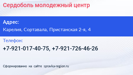 Сердоболь, молодежный центр по адресу Карелия, Сортавала, Пристанская 2-я, 4 в дальнейшем Организация, размещена в следующих категориях: