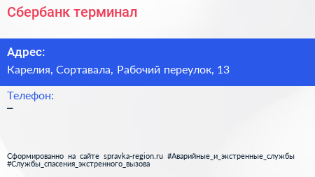 Сбербанк, терминал по адресу Карелия, Сортавала, Рабочий переулок, 13 в дальнейшем Организация, размещена в следующих категориях: