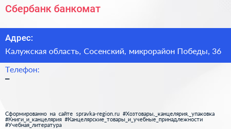 Сбербанк, банкомат по адресу Калужская область, Сосенский, микрорайон Победы, 36 в дальнейшем Организация, размещена в следующих категориях: