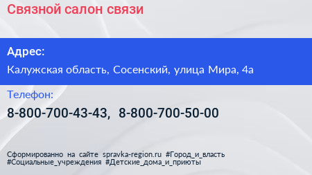Связной, салон связи по адресу Калужская область, Сосенский, улица Мира, 4а в дальнейшем Организация, размещена в следующих категориях: