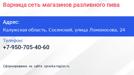 Варница, сеть магазинов разливного пива по адресу Калужская область, Сосенский, улица Ломоносова, 24 в дальнейшем Организация, размещена в следующих категориях: