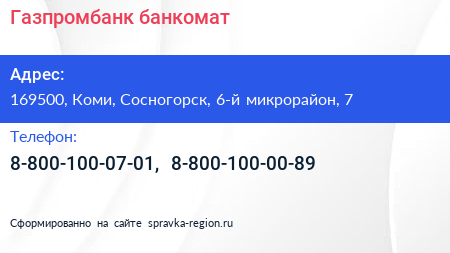 Газпромбанк, банкомат по адресу 169500, Коми, Сосногорск, 6-й микрорайон, 7 в дальнейшем Организация, размещена в следующих категориях: