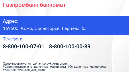 Газпромбанк, банкомат по адресу 169500, Коми, Сосногорск, Герцена, 5а в дальнейшем Организация, размещена в следующих категориях: