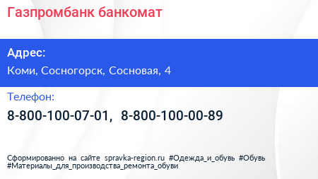 Газпромбанк, банкомат по адресу Коми, Сосногорск, Сосновая, 4 в дальнейшем Организация, размещена в следующих категориях: