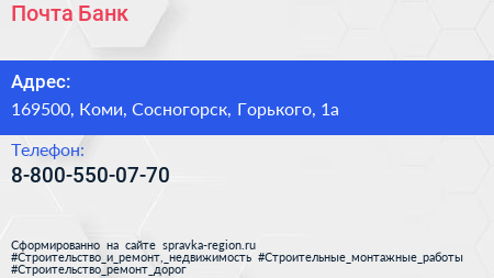 Почта Банк по адресу 169500, Коми, Сосногорск, Горького, 1а в дальнейшем Организация, размещена в следующих категориях: