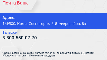 Почта Банк по адресу 169500, Коми, Сосногорск, 6-й микрорайон, 8а в дальнейшем Организация, размещена в следующих категориях: