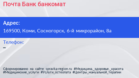 Почта Банк, банкомат по адресу 169500, Коми, Сосногорск, 6-й микрорайон, 8а в дальнейшем Организация, размещена в следующих категориях:
