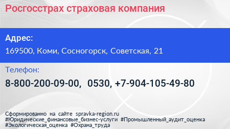 Росгосстрах, страховая компания по адресу 169500, Коми, Сосногорск, Советская, 21 в дальнейшем Организация, размещена в следующих категориях: