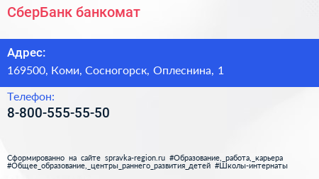 СберБанк, банкомат по адресу 169500, Коми, Сосногорск, Оплеснина, 1 в дальнейшем Организация, размещена в следующих категориях:
