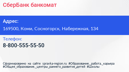 СберБанк, банкомат по адресу 169500, Коми, Сосногорск, Набережная, 134 в дальнейшем Организация, размещена в следующих категориях: