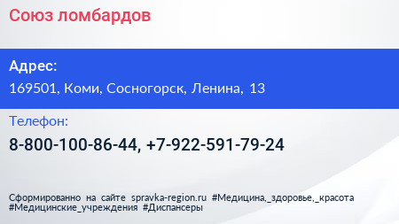 Союз ломбардов по адресу 169501, Коми, Сосногорск, Ленина, 13 в дальнейшем Организация, размещена в следующих категориях: