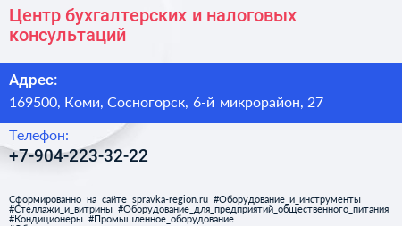 Центр бухгалтерских и налоговых консультаций по адресу 169500, Коми, Сосногорск, 6-й микрорайон, 27 в дальнейшем Организация, размещена в следующих категориях: