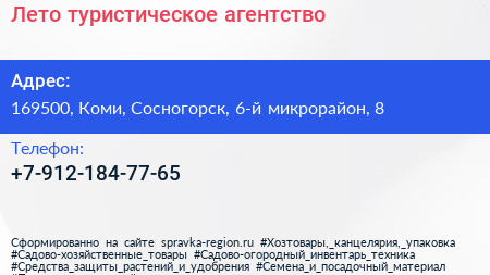Лето, туристическое агентство по адресу 169500, Коми, Сосногорск, 6-й микрорайон, 8 в дальнейшем Организация, размещена в следующих категориях: