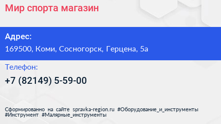 Мир спорта, магазин по адресу 169500, Коми, Сосногорск, Герцена, 5а в дальнейшем Организация, размещена в следующих категориях: