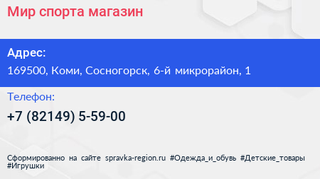 Мир спорта, магазин по адресу 169500, Коми, Сосногорск, 6-й микрорайон, 1 в дальнейшем Организация, размещена в следующих категориях: