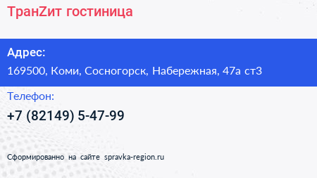 ТранZит, гостиница по адресу 169500, Коми, Сосногорск, Набережная, 47а ст3 в дальнейшем Организация, размещена в следующих категориях: