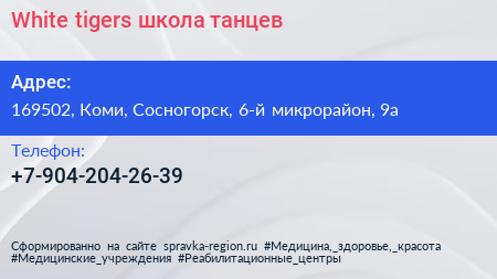 White tigers, школа танцев по адресу 169502, Коми, Сосногорск, 6-й микрорайон, 9а в дальнейшем Организация, размещена в следующих категориях: