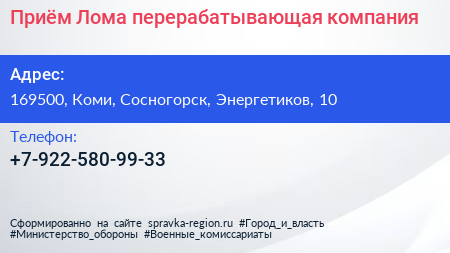 Приём Лома, перерабатывающая компания по адресу 169500, Коми, Сосногорск, Энергетиков, 10 в дальнейшем Организация, размещена в следующих категориях: