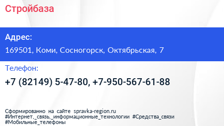 Стройбаза по адресу 169501, Коми, Сосногорск, Октябрьская, 7 в дальнейшем Организация, размещена в следующих категориях: