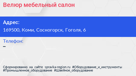 Велюр, мебельный салон по адресу 169500, Коми, Сосногорск, Гоголя, 6 в дальнейшем Организация, размещена в следующих категориях: