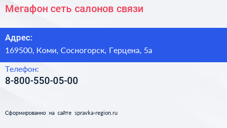 Мегафон, сеть салонов связи по адресу 169500, Коми, Сосногорск, Герцена, 5а в дальнейшем Организация, размещена в следующих категориях: