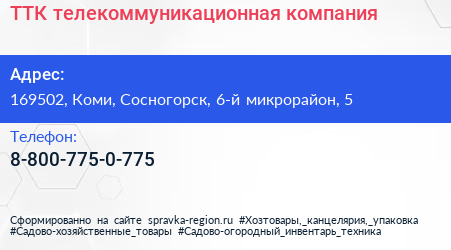 ТТК, телекоммуникационная компания по адресу 169502, Коми, Сосногорск, 6-й микрорайон, 5 в дальнейшем Организация, размещена в следующих категориях: