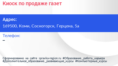 Киоск по продаже газет по адресу 169500, Коми, Сосногорск, Герцена, 5а в дальнейшем Организация, размещена в следующих категориях: