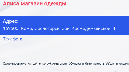 Алиса, магазин одежды по адресу 169500, Коми, Сосногорск, Зои Космодемьянской, 4 в дальнейшем Организация, размещена в следующих категориях: