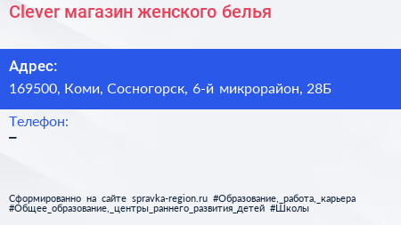 Clever, магазин женского белья по адресу 169500, Коми, Сосногорск, 6-й микрорайон, 28Б в дальнейшем Организация, размещена в следующих категориях: