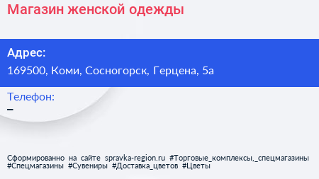 Магазин женской одежды по адресу 169500, Коми, Сосногорск, Герцена, 5а в дальнейшем Организация, размещена в следующих категориях: