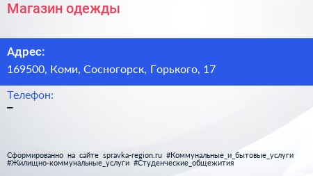 Магазин одежды по адресу 169500, Коми, Сосногорск, Горького, 17 в дальнейшем Организация, размещена в следующих категориях: