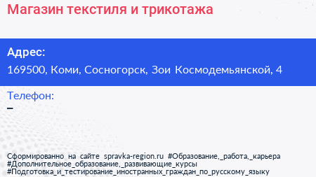 Магазин текстиля и трикотажа по адресу 169500, Коми, Сосногорск, Зои Космодемьянской, 4 в дальнейшем Организация, размещена в следующих категориях: