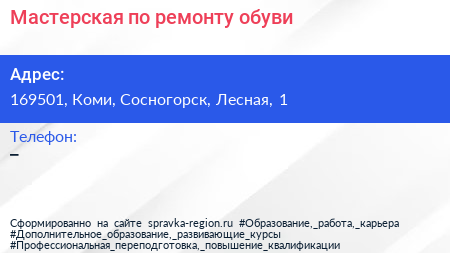 Мастерская по ремонту обуви по адресу 169501, Коми, Сосногорск, Лесная, 1 в дальнейшем Организация, размещена в следующих категориях:
