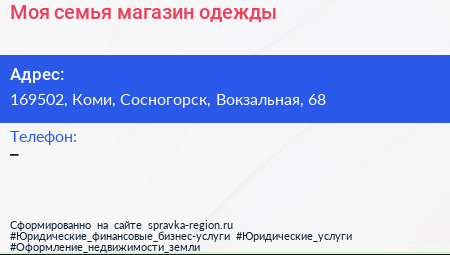 Моя семья, магазин одежды по адресу 169502, Коми, Сосногорск, Вокзальная, 68 в дальнейшем Организация, размещена в следующих категориях: