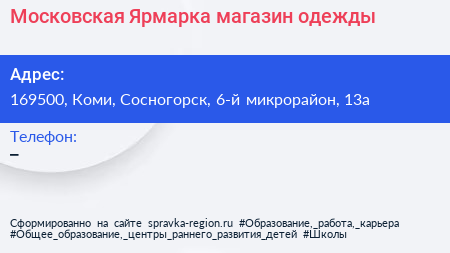 Московская Ярмарка, магазин одежды по адресу 169500, Коми, Сосногорск, 6-й микрорайон, 13а в дальнейшем Организация, размещена в следующих категориях:
