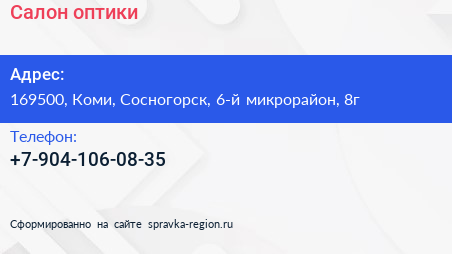 Салон оптики по адресу 169500, Коми, Сосногорск, 6-й микрорайон, 8г в дальнейшем Организация, размещена в следующих категориях:
