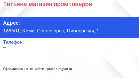 Татьяна, магазин промтоваров по адресу 169501, Коми, Сосногорск, Пионерская, 1 в дальнейшем Организация, размещена в следующих категориях: