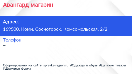 Авангард, магазин по адресу 169500, Коми, Сосногорск, Комсомольская, 2/2 в дальнейшем Организация, размещена в следующих категориях: