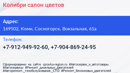 Колибри, салон цветов по адресу 169502, Коми, Сосногорск, Вокзальная, 61а в дальнейшем Организация, размещена в следующих категориях: