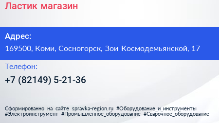 Ластик, магазин по адресу 169500, Коми, Сосногорск, Зои Космодемьянской, 17 в дальнейшем Организация, размещена в следующих категориях: