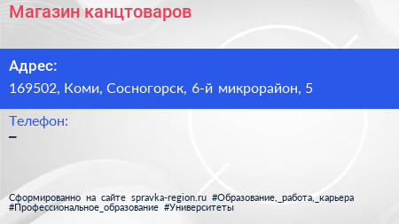 Магазин канцтоваров по адресу 169502, Коми, Сосногорск, 6-й микрорайон, 5 в дальнейшем Организация, размещена в следующих категориях: