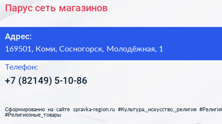 Парус, сеть магазинов по адресу 169501, Коми, Сосногорск, Молодёжная, 1 в дальнейшем Организация, размещена в следующих категориях: