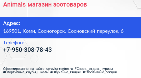 Animals, магазин зоотоваров по адресу 169501, Коми, Сосногорск, Сосновский переулок, 6 в дальнейшем Организация, размещена в следующих категориях: