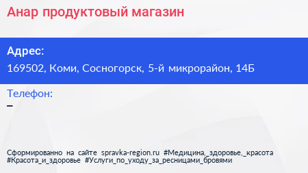 Анар, продуктовый магазин по адресу 169502, Коми, Сосногорск, 5-й микрорайон, 14Б в дальнейшем Организация, размещена в следующих категориях: