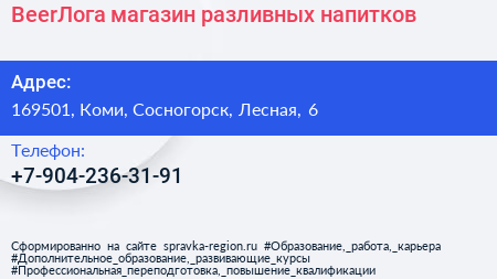 BeerЛога, магазин разливных напитков по адресу 169501, Коми, Сосногорск, Лесная, 6 в дальнейшем Организация, размещена в следующих категориях: