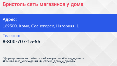 Бристоль, сеть магазинов у дома по адресу 169500, Коми, Сосногорск, Нагорная, 1 в дальнейшем Организация, размещена в следующих категориях: