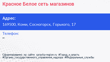 Красное & Белое, сеть магазинов по адресу 169500, Коми, Сосногорск, Горького, 17 в дальнейшем Организация, размещена в следующих категориях: